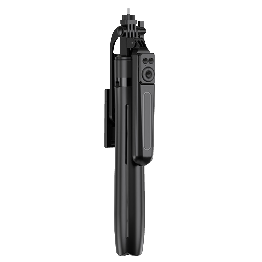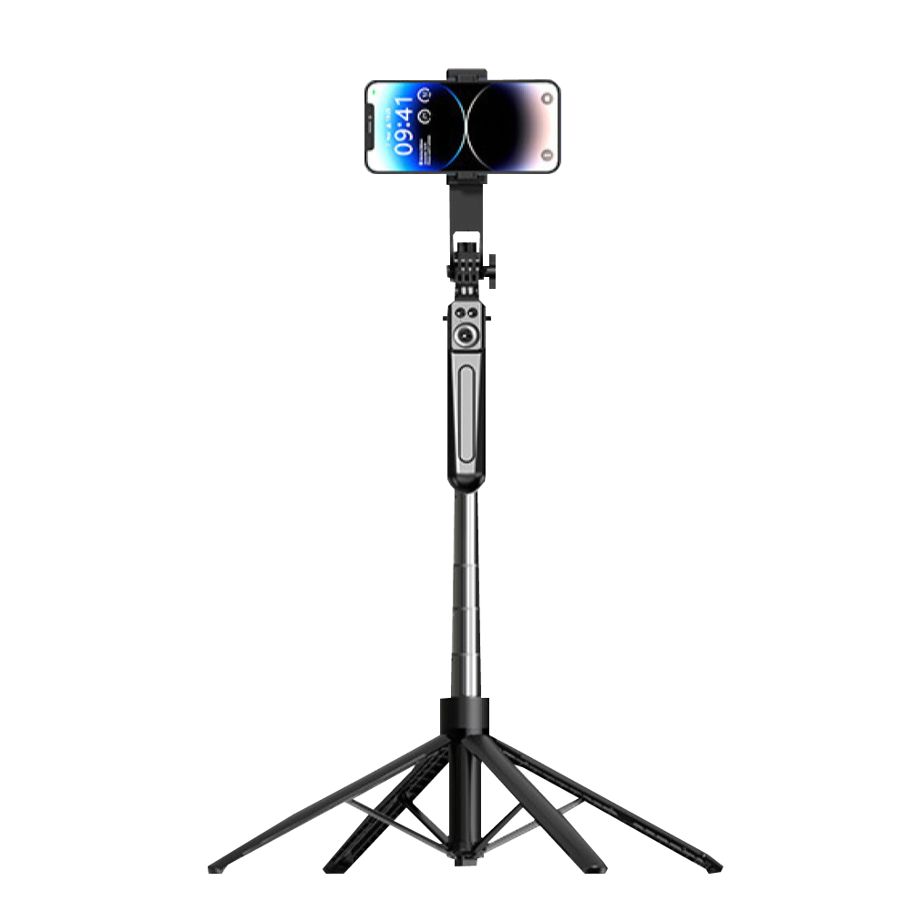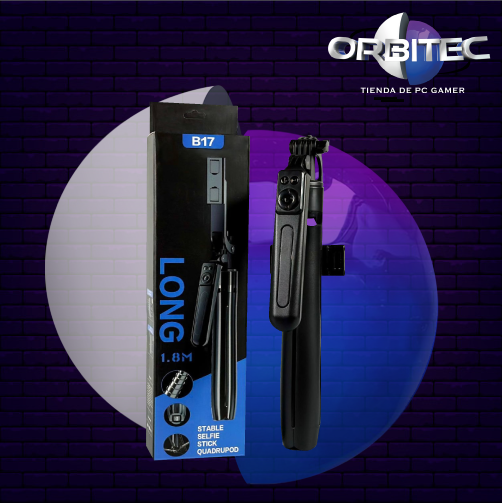 Selfie stick B17 con trípode quadrupod estable, altura ajustable hasta 1.8 m y control remoto Bluetooth integrado, ideal para fotos y videos profesionales con total estabilidad.